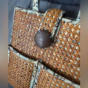 Vera Bradley Large Tiki Tote In Bali Blue Great condition. There are some light stains from use 14 inch Tall x 12.5 inches wide 4” wide base. Has 2 large front pockets. Inside has one zipper pocket and 2 slip pockets. Snap flap over closure. 2 padded handles. Fabric with wicker/rattan like overlay