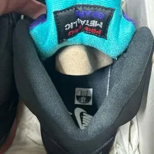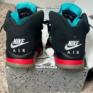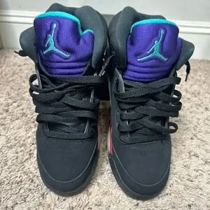 Jordan 5 Retro Top 3 sneakers combine iconic elements from the Grape, Fire Red, and Metallic colorways into one striking design. These mid-top basketball shoes feature a black nubuck upper with vibrant purple and aqua tongues, red midsoles with silver shark tooth detailing, and the classic translucent outsole. Embroidered '23' branding on the heel and Nike Air logos maintain the heritage aesthetic, while the padded collar and lace-up closure ensure a secure fit for active kids. Perfect for collectors or daily wear, these multi-color kicks offer a bold look that celebrates the history of the AJ5.