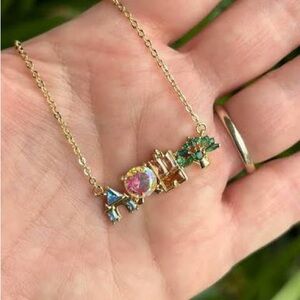 Elegant gold necklace featuring a castle and tree design with colorful rhinestone crystals. Perfect for adding a whimsical touch to any outfit.