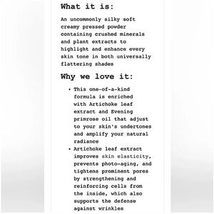 An uncommonly silky soft creamy pressed powder containing crushed minerals and plant extracts to highlight and enhance every skin tone in both universally flattering shades