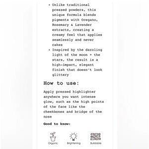 Unlike traditional pressed powders, this unique formula blends pigments with Oregano, Rosemary & Lavender extracts, creating a creamy feel that applies seamlessly and never cakes!