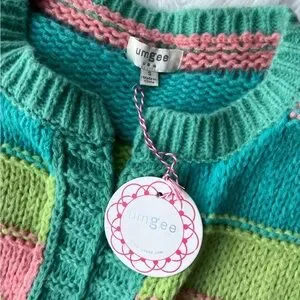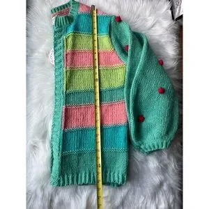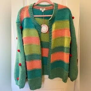 Brighten up your wardrobe with this vibrant Umgee Multicolor Cardigan Sweater. Crafted from cozy cable-knit fabric, this sweater features playful pom pom detailing on the sleeves and a trendy color block pattern that adds a splash of fun to any casual outing. It is perfect for those crisp fall days, whether you're meeting friends for coffee or enjoying a leisurely stroll in the park. With its oversized fit, this sweater promises comfort and style. New with tags.