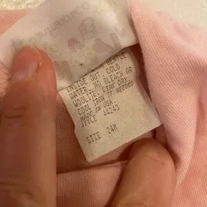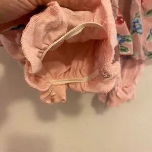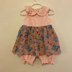 Charming pink baby dress by Chicken Noodle. Features a cute design with matching bloomers. Ideal for special occasions. Peter Pan collar with flower detail.