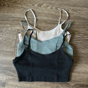 Discover the perfect blend of comfort and style with Aerie's ribbed camisole trio. Includes versatile black, soothing green, and soft cream. Ideal for layering or wearing alone. In great condition