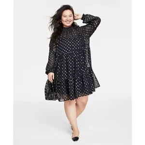 Chic and festive, this ON 34th tiered mini dress features shimmering gold metallic polka dots over sheer black fabric. Designed with a smocked mock neck, long sleeves, and a relaxed tiered silhouette — perfect for parties, date nights, or holiday gatherings.