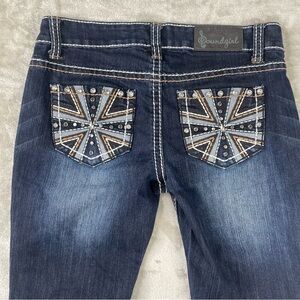 Keywords: Soundgirl, Y2K jeans, McBling, low rise, flare leg, bootcut, rhinestone pockets, Union Jack, British flag, studded, thick stitch, grunge, 2000s fashion, scene style, juniors size 7, dark wash, embellished denim