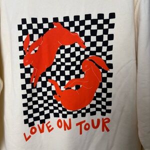 Never worn Love On Tour crew neck pullover. Cream off-white color. One very small spot on the right arm shown, hasn’t been treated. Wear to lounge or to the Together Together tour. Size large, fitted. Great condition!