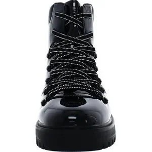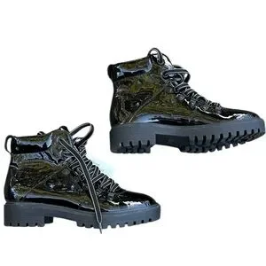 Waterproof patent leather with a worn-in finish and Micronylex lining provides all-weather durability to a hiker-style boot set on a sturdy lug sole.