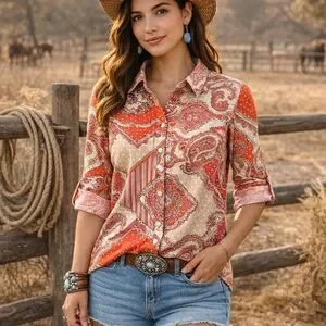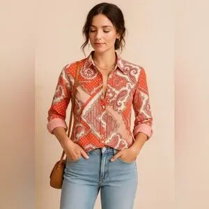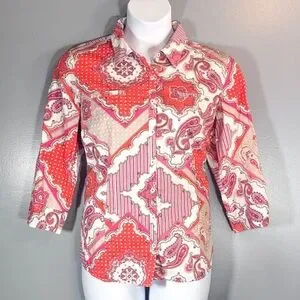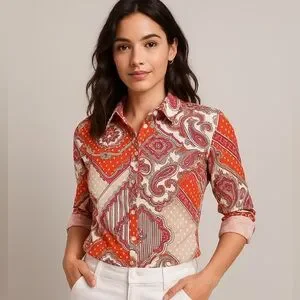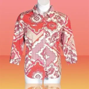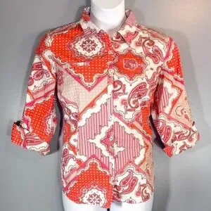Eye-catching Van Heusen button-front shirt featuring a bold patchwork paisley print in red, pink, cream, and tan tones. This top has a polished yet playful look with a classic collar and flattering 3/4 roll-tab sleeves, making it perfect for work, brunch, or casual wear.