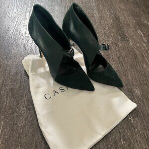 Command attention with these striking CASADEI pumps, a masterful fusion of rich dark green suede and smooth leather. The daring cutouts and sharp pointed toe create a silhouette that is both sophisticated and alluring, while the elegant stiletto heel elongates your legs with every step. A delicate ankle strap with a buckle closure adds a touch of refined detail and ensures a secure, comfortable fit. These heels are perfect for making a statement at an evening gala, a sophisticated dinner date, or a glamorous cocktail party.
