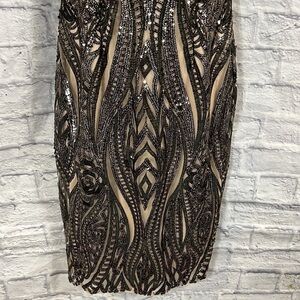 This placement sequin short dress features halter bodice and sheath skirt.