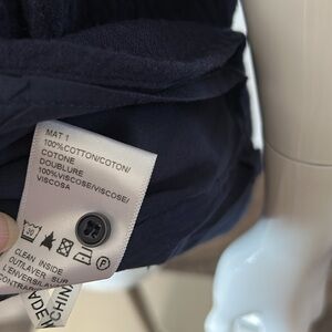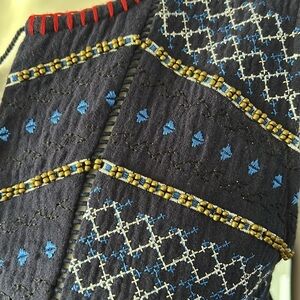 Deep blue with blue, white, and red embroidered details. Cut out detailing and brass colored beads also adorn the bodice. Tie tassel front.