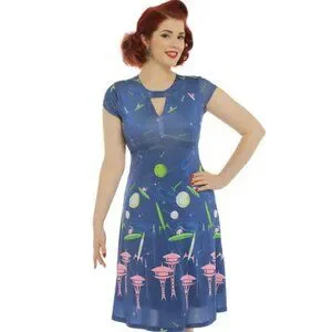 Adorable vintage-inspired and hard-to-find "Blue Space Dog" lined mod retro pin-up dress. Size 16 (tag has been cut out.) Fabulous condition. Comfortable, stretchy fabric.