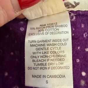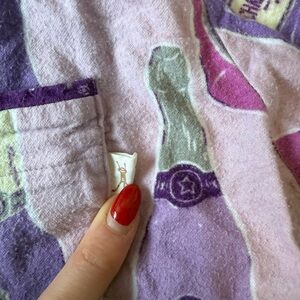Soft pajama top with playful champagne bottle design. Features lavender and pink hues.