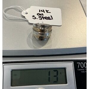 Chunky statement ring featuring mixed metals. The ring's design features alternating bands of stainless steel and 14K gold accents, creating a striking visual contrast. A substantial and eye-catching piece, the ring has a wide band design. Marked 14K on S. Steel and NR S/S.
