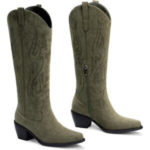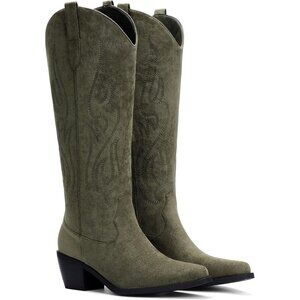Women's Green Knee High Wide Calf Cowgirl Boots Slip On Pointed Toe Chunky Heel