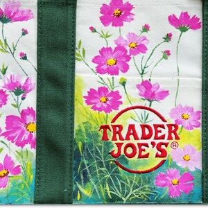 Hand-painted Trader Joe’s mini canvas tote with pink floral design on one side, green handles, and sturdy canvas material. Perfect for lunch, small errands, or gifting.