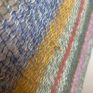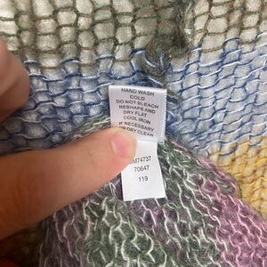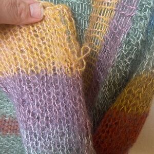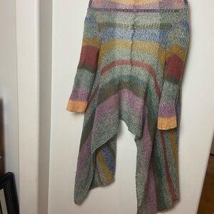 Stylish open front cardigan. Features colorful stripes. Perfect for layering. Few minor pulls. See photos. Nothing unraveling.