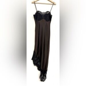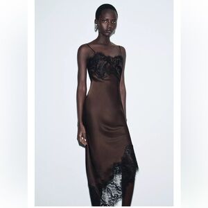 NWT Zara Asymmetric Satin Lace Dress in Black/ Brown Size M