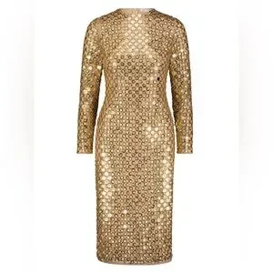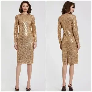 ✨ Mac Duggal Gold Beaded Georgette Long Sleeve Fitted Midi Dress ✨