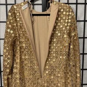Beautiful overall condition. Due to the nature of the intricate allover beading and sequins, there may be a few loose or missing embellishments, which is common with heavily embellished pieces. I did not notice any major flaws or anything obvious that catches the eye. The dress presents beautifully and sparkles stunningly when worn.
