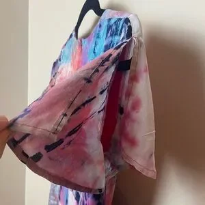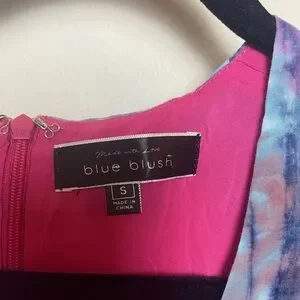 Chic romper with a blend of pink and blue. Perfect for casual outings. Is super soft and features split sleeves abd a zippered back.