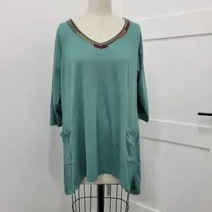 LOGO Lori Goldstein Women's Green Knit Pocket Beaded Tunic Top Blouse Boho 1X