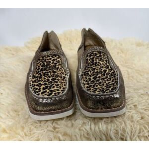 Ariat women’s slip-on casual loafers featuring metallic bronze leather with leopard print vamp. Western-inspired comfort shoe perfect for rodeo weekends, barrel racing events, stock shows, and everyday ranch wear.