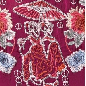The oversized bohemian blouse has a scoop neck & is covered in intricate embroidery. There is white wave embroidery along the hem and sleeves. The bodice is covered in vibrant flowers and at the center is a whimsical scene with two Geishas under an umbrella. The top is a pullover style made from 100% cupra rayon.