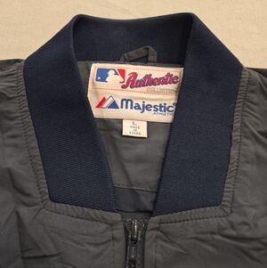 The product is a vintage 90s Majestic Atlanta Braves bomber jacket with a 1/2 zip closure. This officially licensed MLB fan apparel in size Large features the team's iconic blue colors. The jacket is designed for men and represents the Major League Baseball season, making it a perfect item for any Atlanta Braves fan looking to show their team pride.