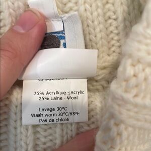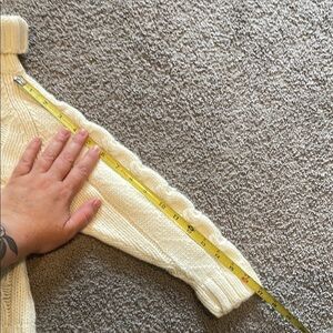 This cream sweater features intricate cable knit patterns with a ribbed turtleneck for added warmth and style. Made from thick, chunky yarn, it offers a cozy feel perfect for winter days. The traditional Aran-style designs add a timeless touch to this classic piece.