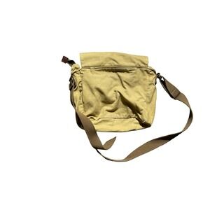 Made from durable heavy canvas with adjustable shoulder strap. Features front flap closure with snap pockets and multiple compartments for storage.