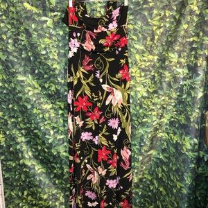 Embrace elegance with this stunning floral halter neck jumpsuit. The black base is beautifully contrasted with vibrant pink and green floral patterns, perfect for any occasion.