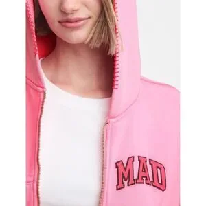 Our MadHappy & Gap Women's Mad Full Zip Crop Hoodie features a front embroidered "MAD" logo, sleeve embroidered "Madhappy" logo, sleeve embroidered "Gap" logo, and blanket hood stitch.