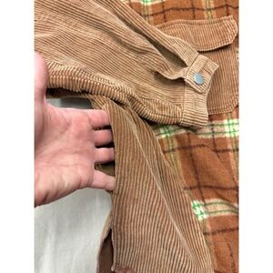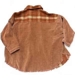 Fantastic Fawn plaid corduroy oversized shacket shirt jacket. This unique piece combines classic plaid flannel with contrasting corduroy panels on the sleeves and sides. Features a collared neckline, button-up front closure, two chest flap pockets with button closures, and a raw frayed hemline.