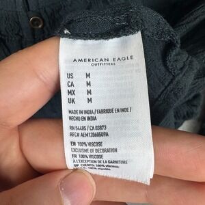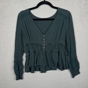This American Eagle women's blouse has a relaxed boho feel with its button-front design, peplum-style waist, and crochet lace accents. Crafted from 100% viscose in a deep green hue, it features long sleeves with lace insets on the shoulders and at the wrists for added texture. The flowy fit makes it perfect for layering or wearing on its own for a casual yet feminine look.