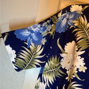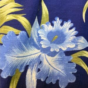 Vibrant tropical print with blue and white flowers. Ideal for casual wear.