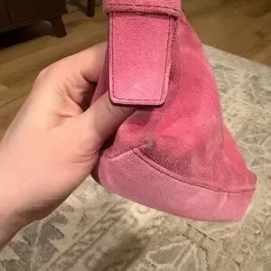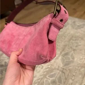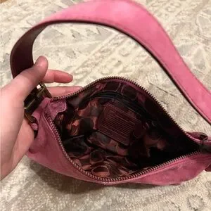 This elegant Coach pink suede shoulder bag is perfect for any occasion. Its fun, Y2K design and rich color make it a stylish addition to your wardrobe. Slight wear on bottom corners- see photos.
