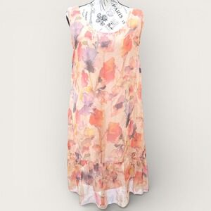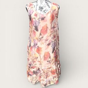 Rosemarine Italy sleeveless midi dress showcases a beautiful watercolor floral print in warm shades of peach, orange, and purple. Crafted from a luxurious viscose and silk blend, this lightweight piece features a scoop neckline and a feminine ruffled hem for a breezy, romantic silhouette. The dress is fully lined with a soft stretch jersey for comfort and ease of wear.