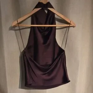 Elegant black satin camisole. Features a sleek halter neck design. Perfect for evening wear.