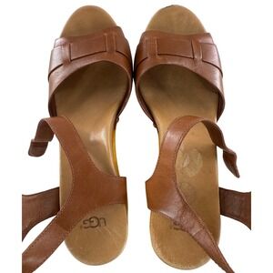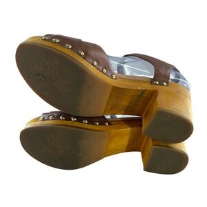Keywords: UGG, Brown leather sandals, Heeled sandals, Wooden clogs, Women's shoes, Adjustable buckle, Block heel, Studded accents, Casual sandals, Summer footwear, Open toe sandals, Bohemian style