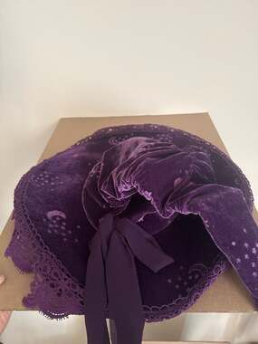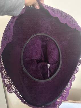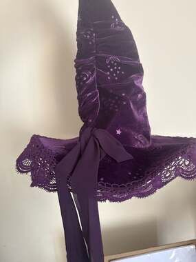Deluxe Celestial Witch Hat in deep purple velvet. Features moon and star embossed prints throughout the cone and brim. The hat is accented with a wide, intricate lace trim around the edge and a matching purple chiffon ribbon tie. Excellent pre-owned condition with no visible flaws or tears. Perfect for Halloween, cosplay, or festival wear. 95% Polyester, 5% Spandex blend for a comfortable, slightly flexible fit.