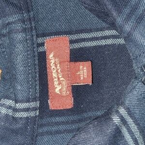Previously owned, gently worn and freshly dry cleaned. Blue plaid Arizona Jeans flannel shirt. Long sleeve. Two button cuffs. Very starched! Two front pockets that button. 100% cotton.