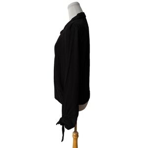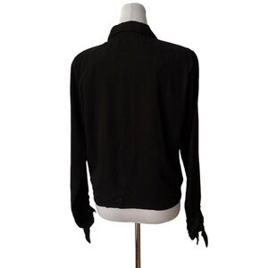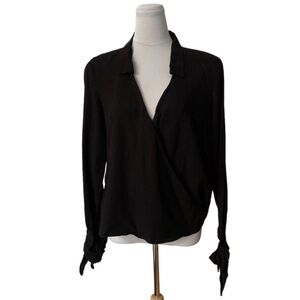 It has adjustable ties on the cuffs and a crossover design. It is soft and airy and can be dressed up or down.