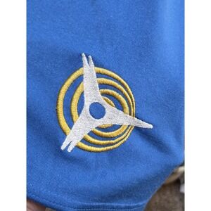 Color: Blue with white textured horizontal stripe across chest and sleeves and multicolor embroidered logos.