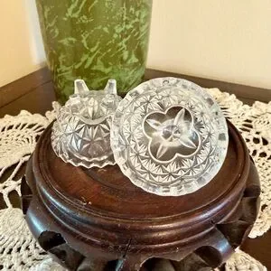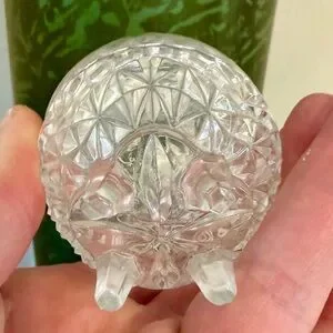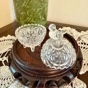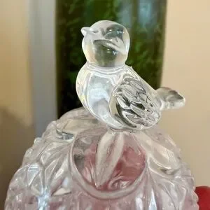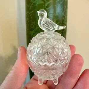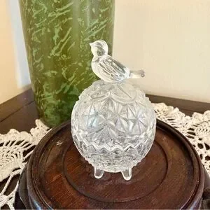 Features: Clear pressed crystal with faceted design and a bird-shaped lid.