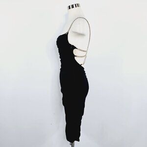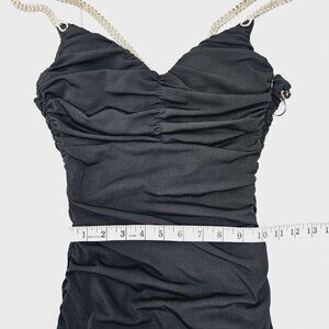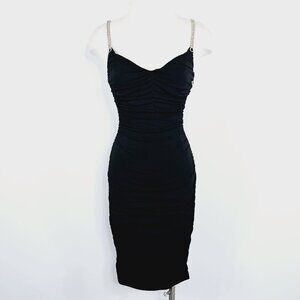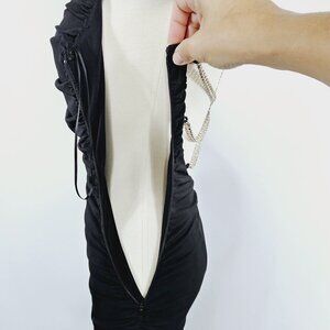 Vintage Cache Y2K Black Ruched Bodycon Dress 6 Rhinestone Chain Back Cocktail