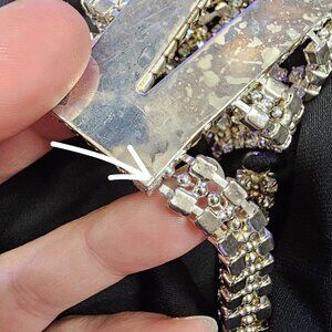One rhinestone back strap has come unattached from the V back connector on one side (see close-up photo). All pieces are intact and could potentially be repaired. Light surface wear to metal hardware consistent with age. No missing stones observed.