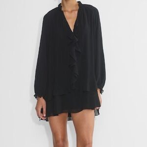 This is a babydoll ruffle dress with long raglan sleeves and a relaxed fit. It's cut from drapey, semi-sheer chiffon with a fine texture. This fabric is made with 100% recycled polyester.