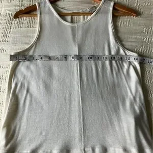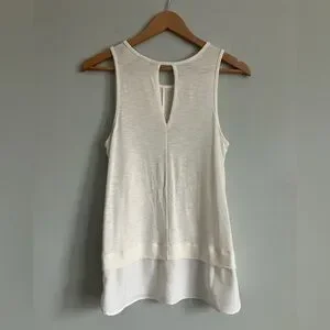 A great neutral tank for wearing as is or under a layering piece. It has a softer smooth cotton fabric at the bodice and a light weight chiffon fabric at the hem. Perfect for wearing with faux leather leggings or denim but also for pairing under a duster cardigan or blazer.